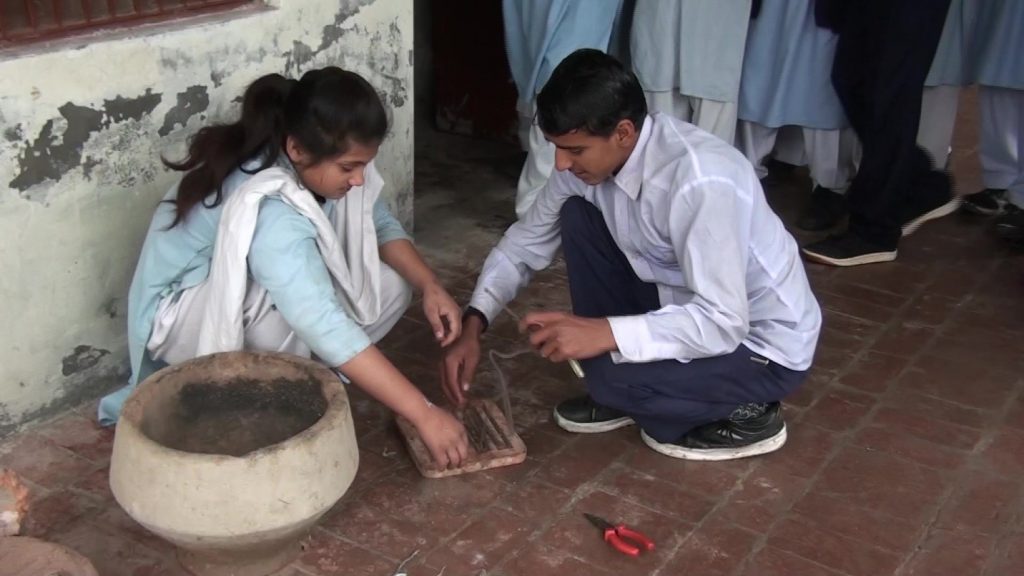 Material that was used was easy to obtain which was an earthen pot, a clay plate with grooves, cables and coils. Samra and Irfan took up the task of putting the different parts together. Rubab brought dry sand in a pot that would be used as an insulator, while others watched. All this was deftly put together by Irfan. Inserting the coil seemed to be a very intricate task and finally screwing it down on the clay plate. Questions were raised and answered about conduction, good and bad conductors, why was insulation required. And the teaching about electricity, circuits and electric current, fuse and static electricity was built on their knowledge they already had.